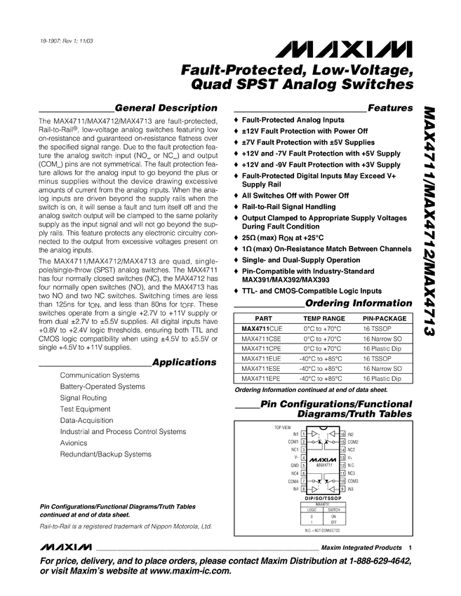 MAX4711, MAX4712, MAX4713 Fault-Protected, Low-Voltage, Quad SPST Analog Switches
