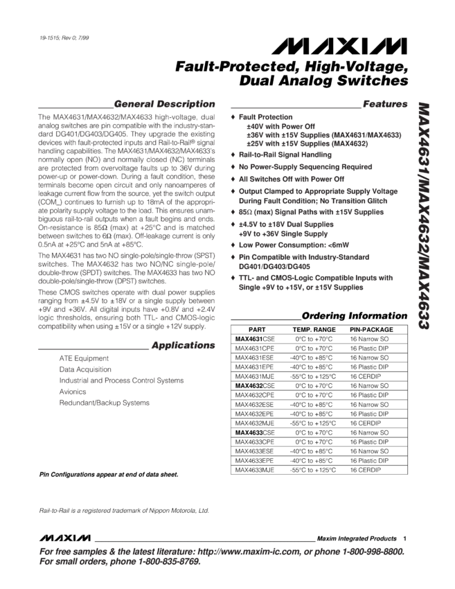 MAX4631, MAX4632, MAX4633 Fault-Protected, High-Voltage, Dual Analog Switches