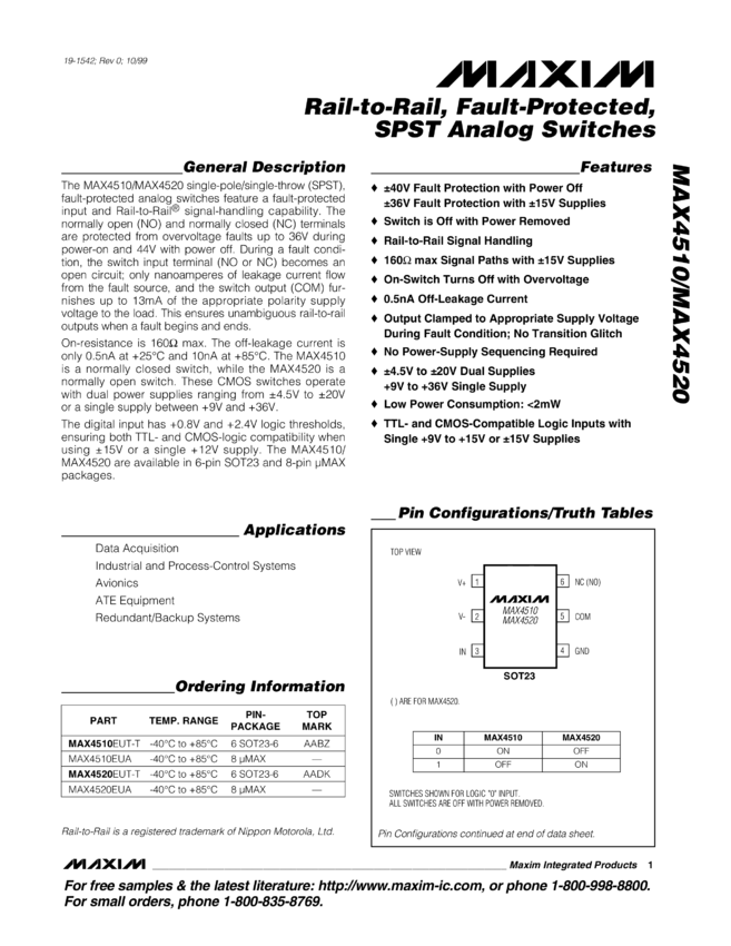 MAX4510, MAX4520 Rail-to-Rail, Fault-Protected, SPST Analog Switches