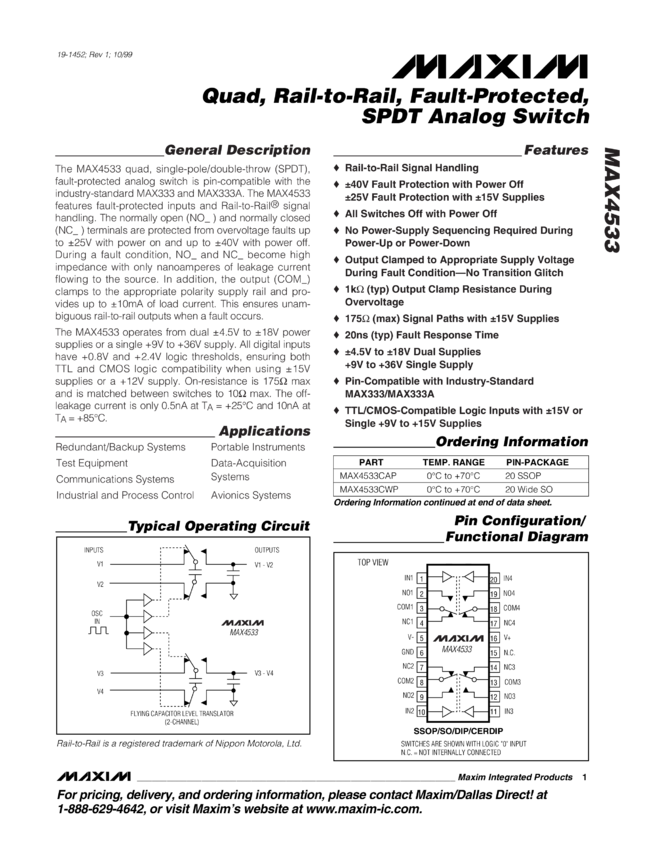 MAX4533 Quad, Rail-to-Rail, Fault-Protected, SPDT Analog Switch