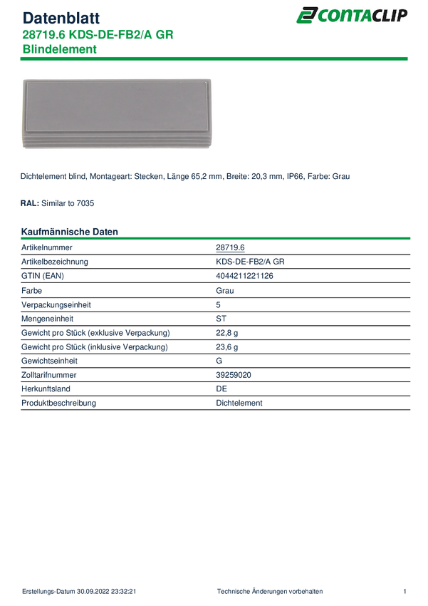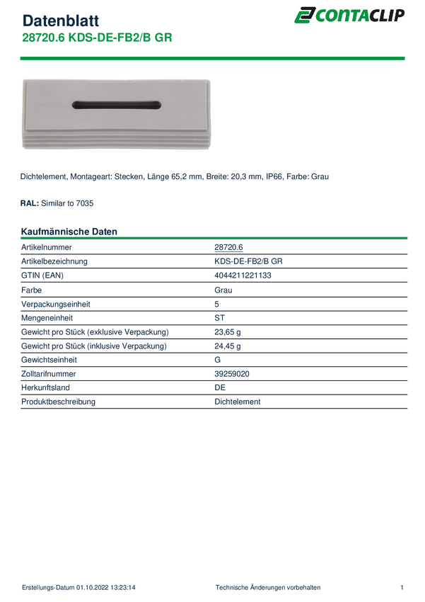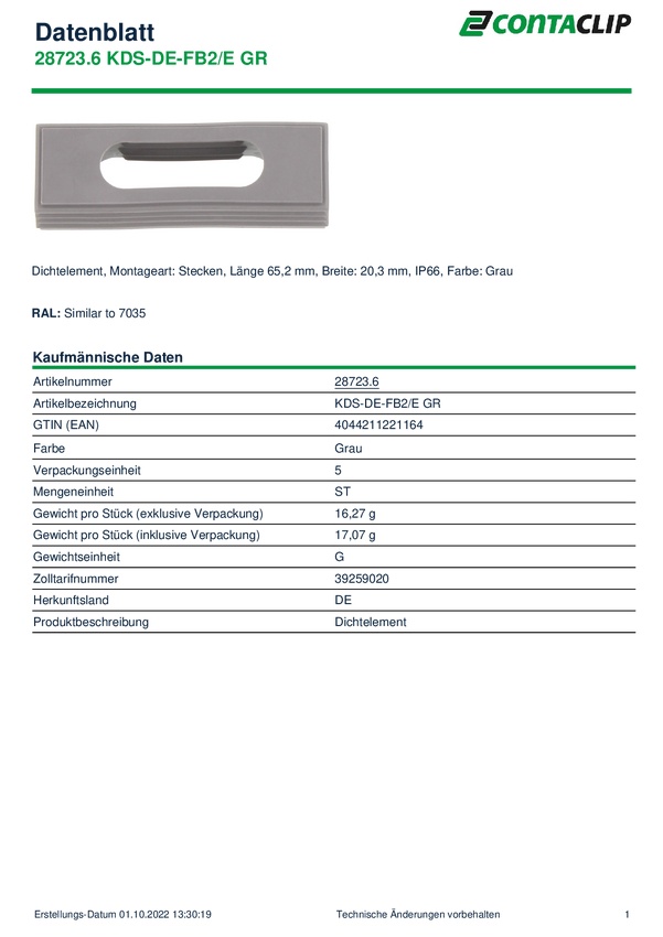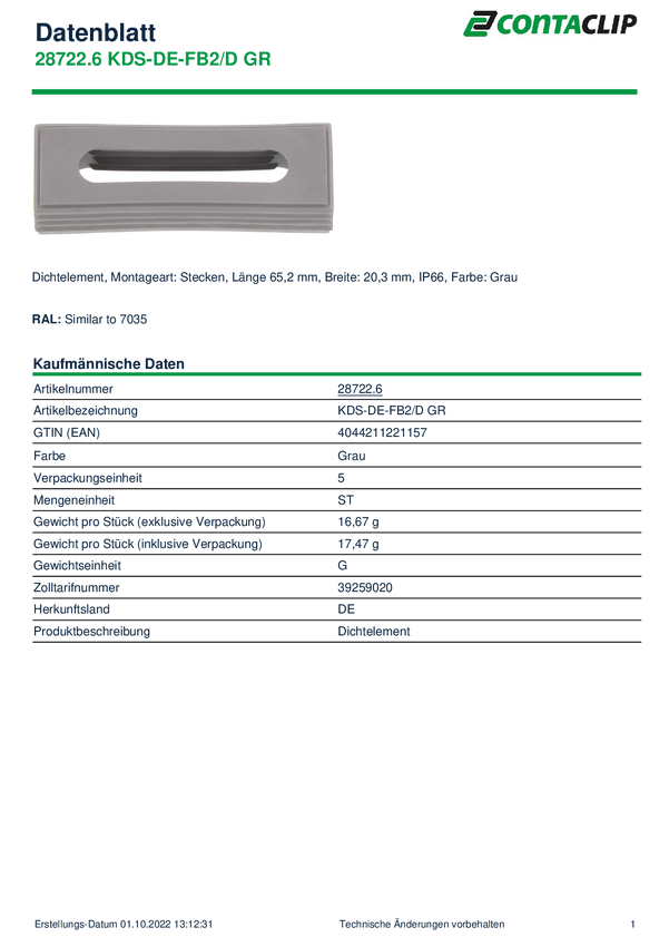 CONTA-CLIP 28721.6 Element uszczelniający KDS-DE-FB2/C GR, (D x S x W) 65.2 x 20.3 x 17.7 mm, termoplastyczny elastomer,