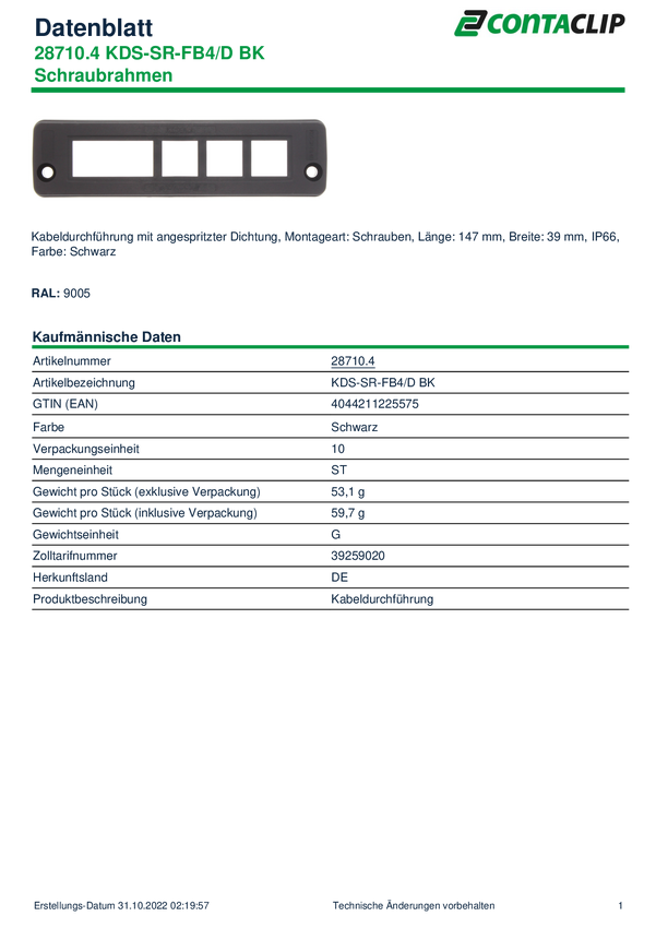 CONTA-CLIP 28710.4 Przepust kablowy KDS-SR-FB4/D BK, (D x S x W) 147 x 39 x 19 mm, poliamid 6.6, 1 szt.