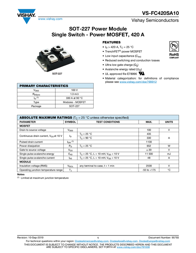 SOT-227 Power Module Single Switch - Power MOSFET, 420 A