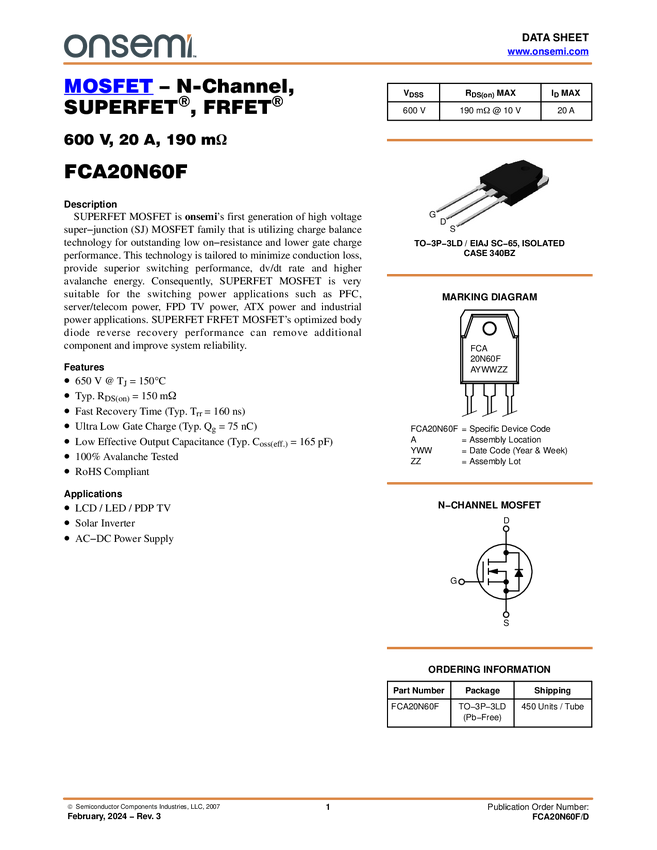 Power MOSFET, N-Channel, SuperFET<sup>®, FRFET<sup>®, 600V, 20A, 190mΩ, TO-3P