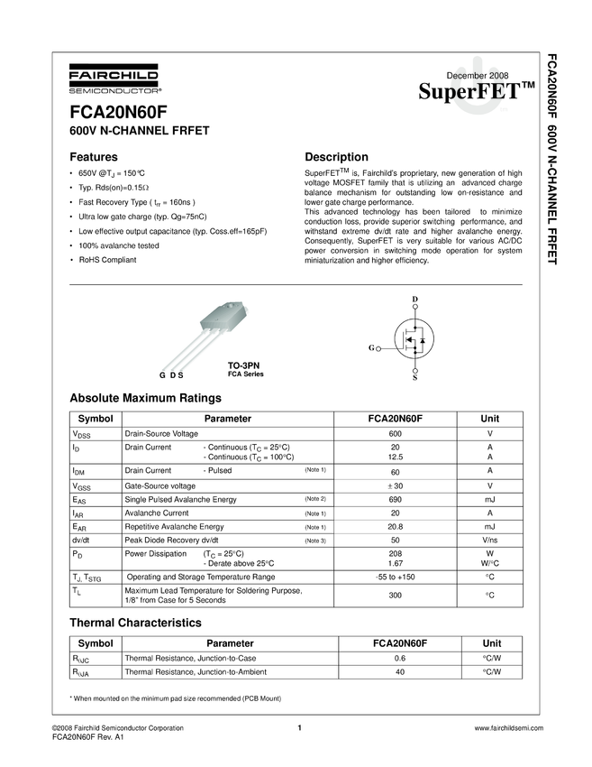 N-Channel SuperFET® FRFET® MOSFET 600V, 20A, 190mΩ