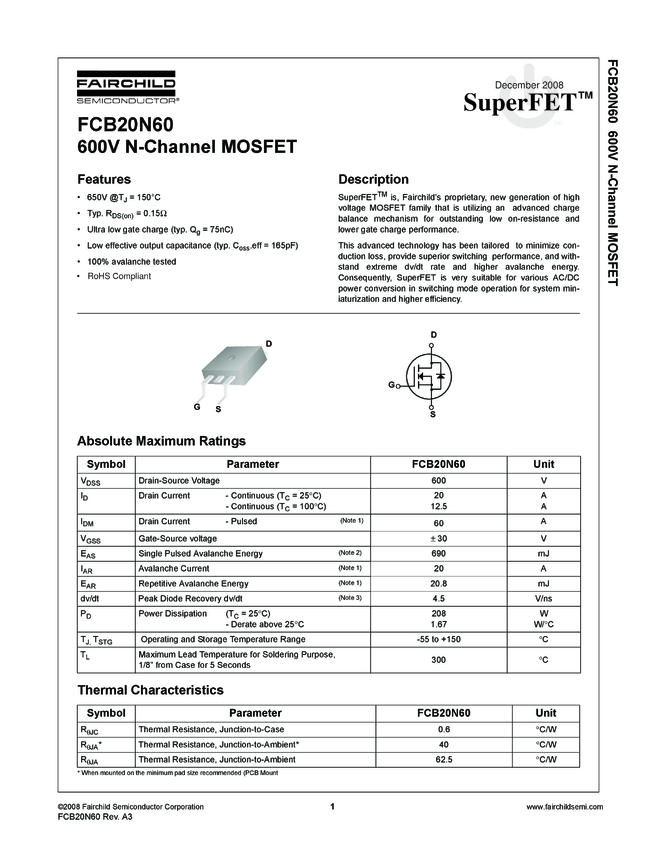 600V, 20A, 173mΩ, D2PAKN-Channel SuperFET™