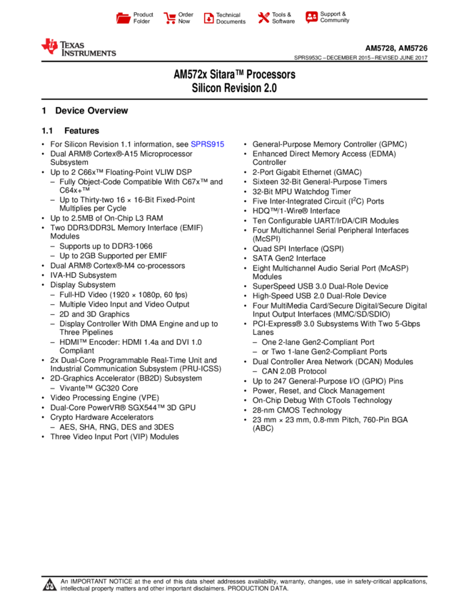 MPU AM572x RISC 32-Bit 1000MHz 1.8V/3.3V 760-Pin FCBGA