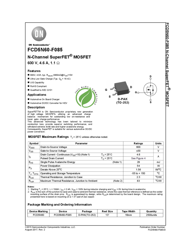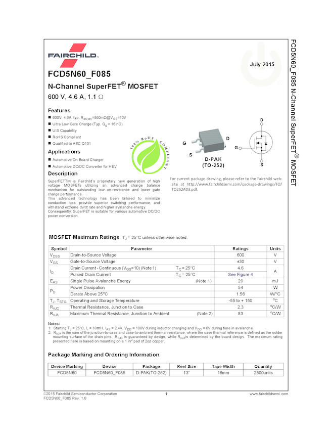 N-Channel SuperFET® MOSFET 600V, 4.6A, 950mΩ