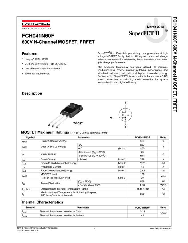 SuperFET® II MOSFET is Fairchild Semiconductor’s brand-newhigh voltage super-junction (SJ) MOSFET family that is utilizingcharge balance technology for outstanding low on-resistanceand lower gate charge performance