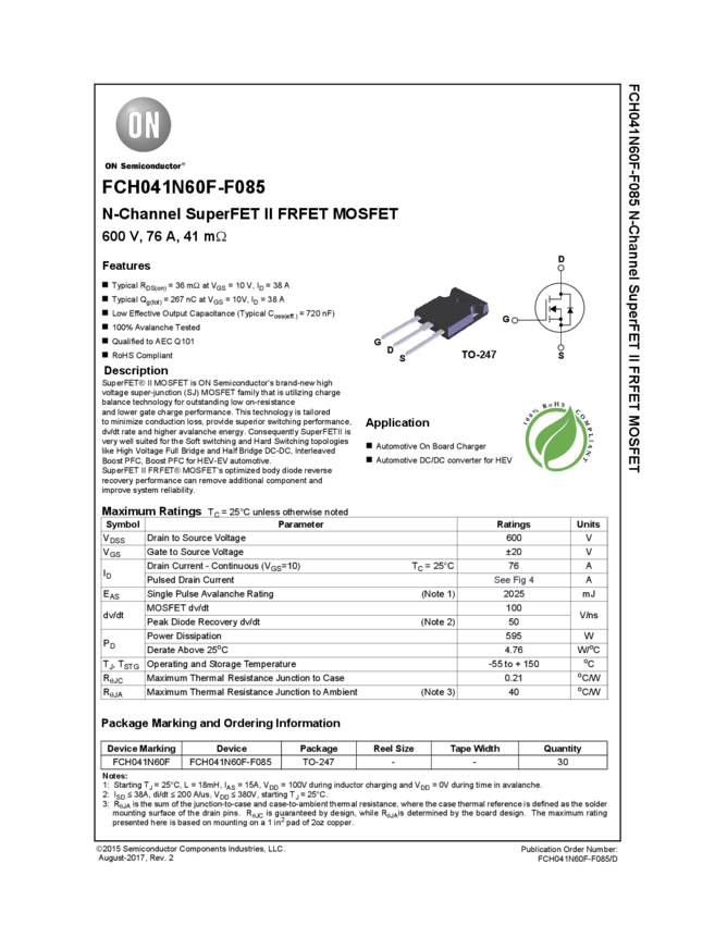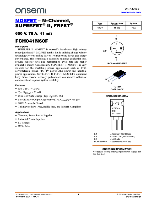 N-Channel SuperFET® II FRFET® MOSFET 600V, 76A, 41mΩ