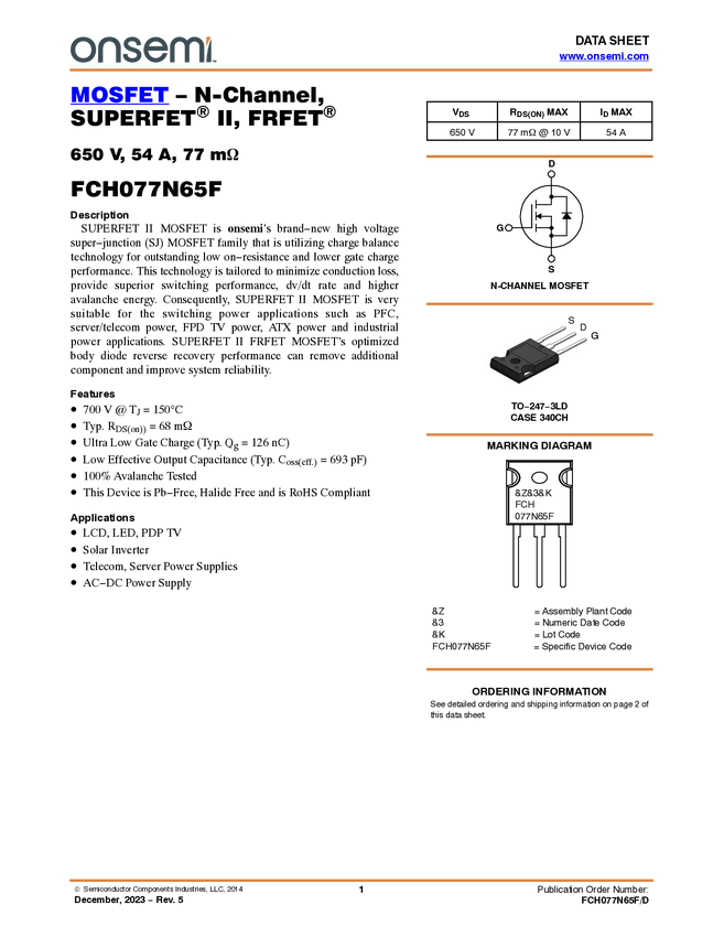 Power MOSFET, N-Channel, SUPERFET<sup>® II, FRFET<sup>®, 650 V, 54 A, 77 mΩ, TO-247