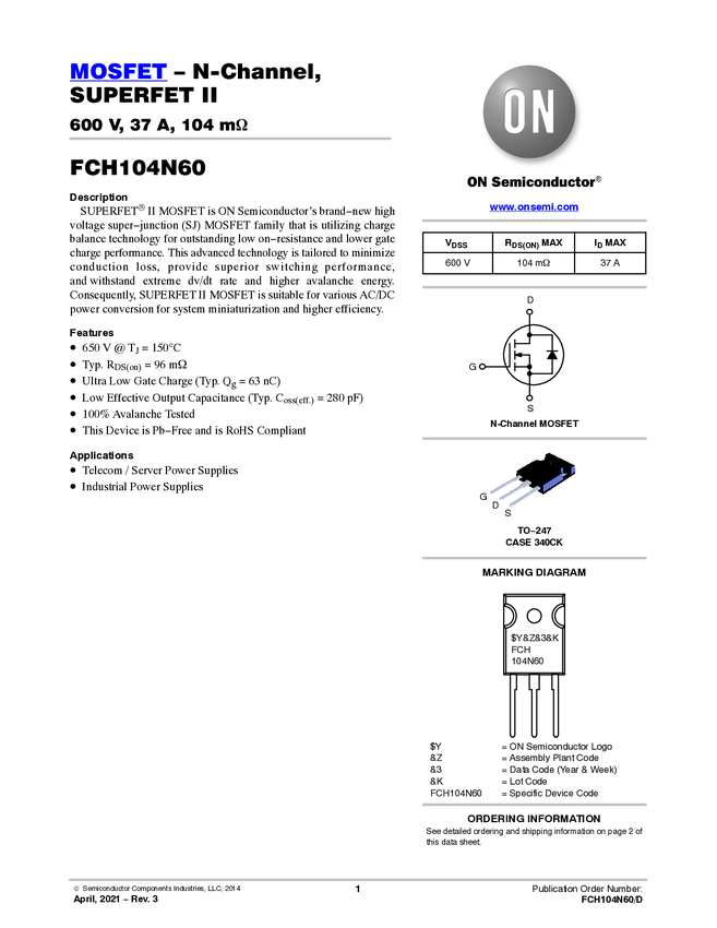 Power MOSFET, N-Channel, SUPERFET<sup>® II, FAST, 600 V, 37 A, 104 mΩ, TO-247