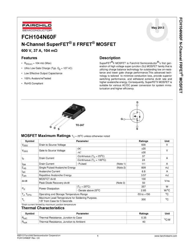 N-Channel SuperFET® II FRFET® MOSFET 600V, 37A, 104mΩ