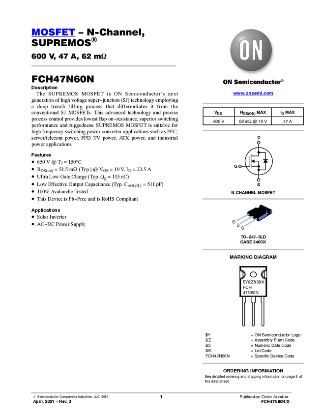 N-Channel SupreMOS® MOSFET 600V, 47A, 62mΩ