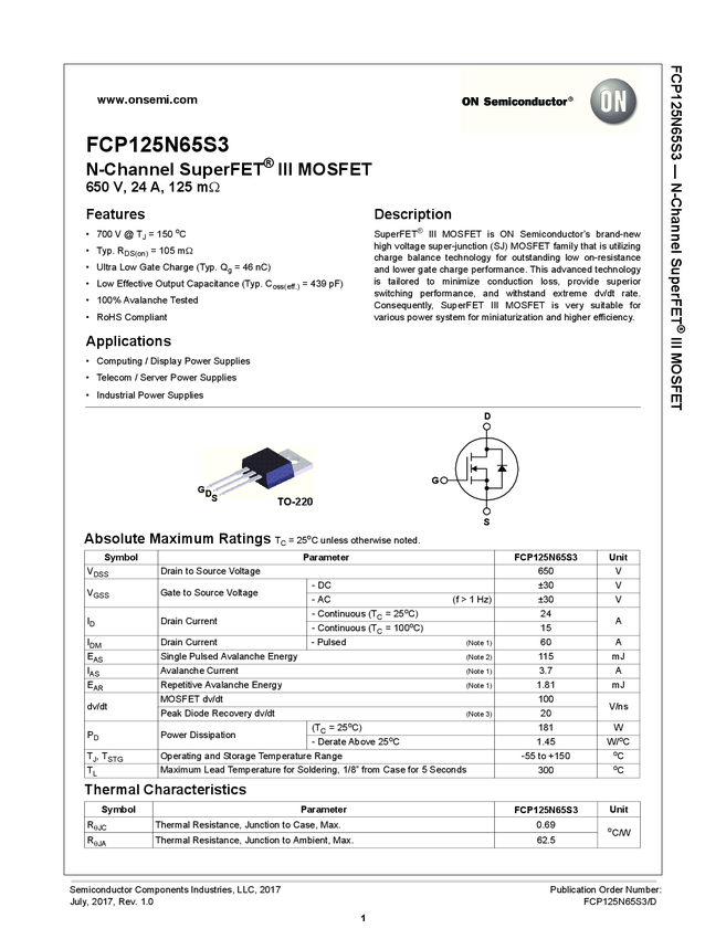 N-Channel SuperFET® III MOSFET 650 V, 24 A, 125 mΩ