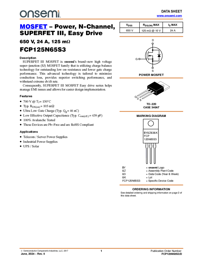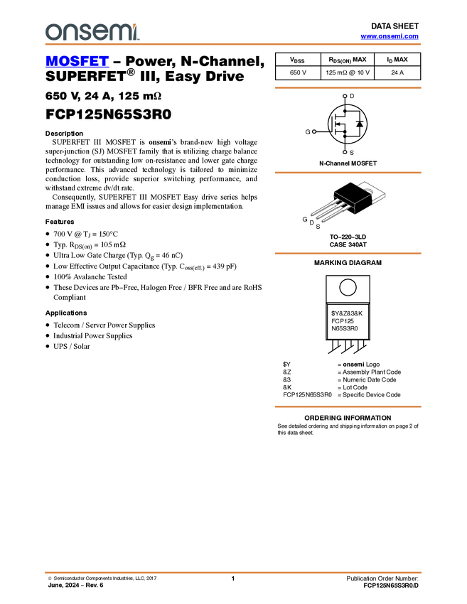 Power MOSFET, N-Channel, SUPERFET<sup>® III, Easy Drive, 650 V, 24 A, 125 mΩ, TO-220