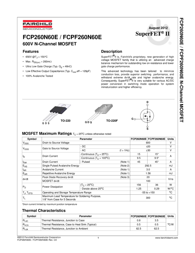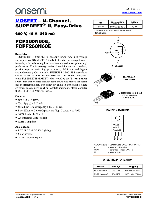 N-Channel SuperFET® II Easy-Drive MOSFET 600 V, 15 A, 260 mΩ
