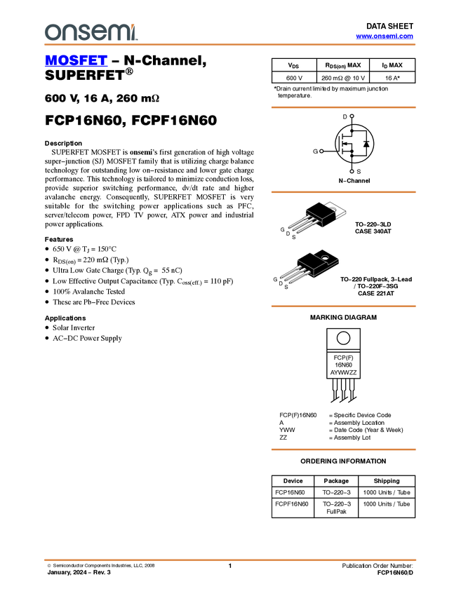 N-Channel SupreMOS® MOSFET 600V, 16A, 199mΩ