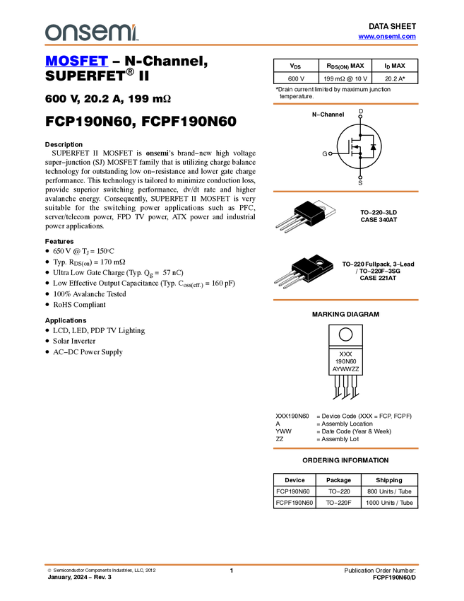 Power MOSFET, N-Channel, SUPERFET<sup>® II, FAST, 600V, 20.2A, 199mΩ, TO-220F