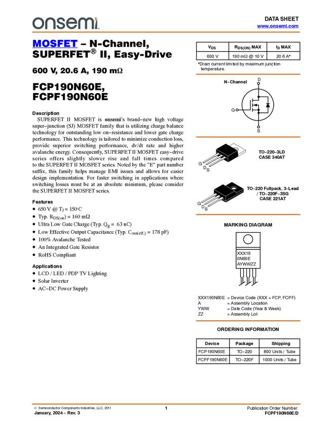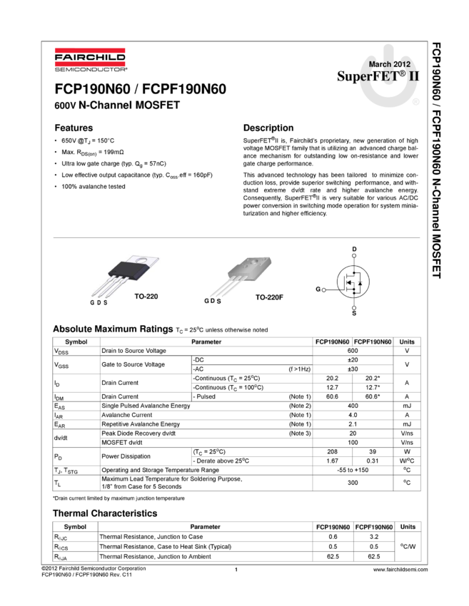 N-Channel SuperFET® II Easy-Drive MOSFET 600V, 20.6A, 190mΩ