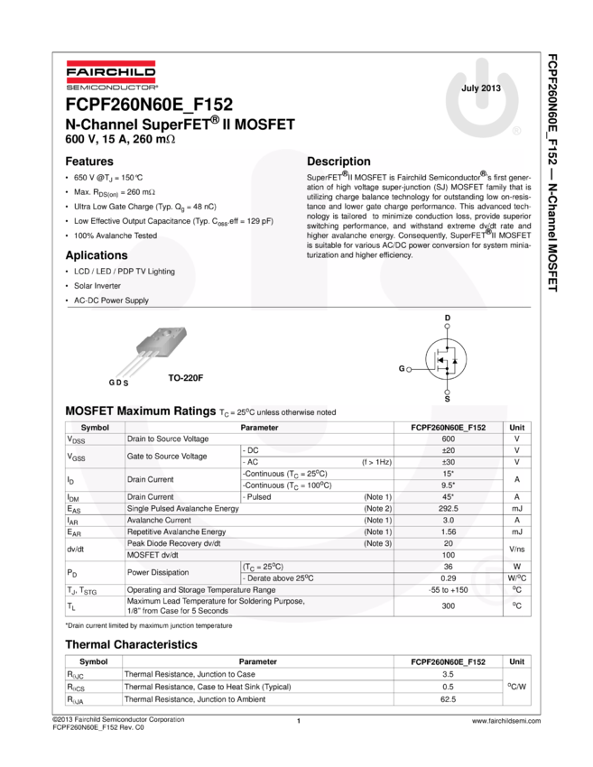 N-Channel SuperFET® II Easy-Drive MOSFET 600 V, 15 A, 260 mΩ