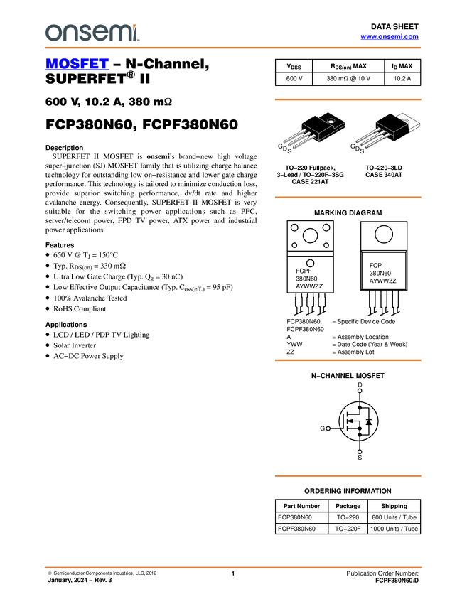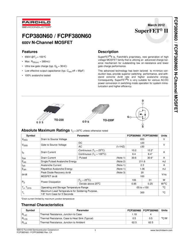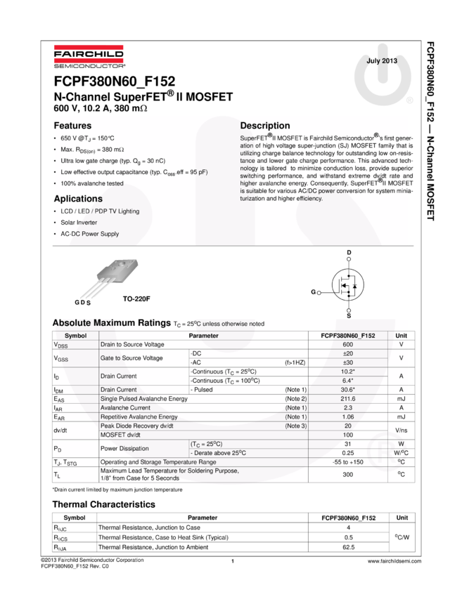 N-Channel SuperFET® II MOSFET 600V, 10.2A, 380mΩ