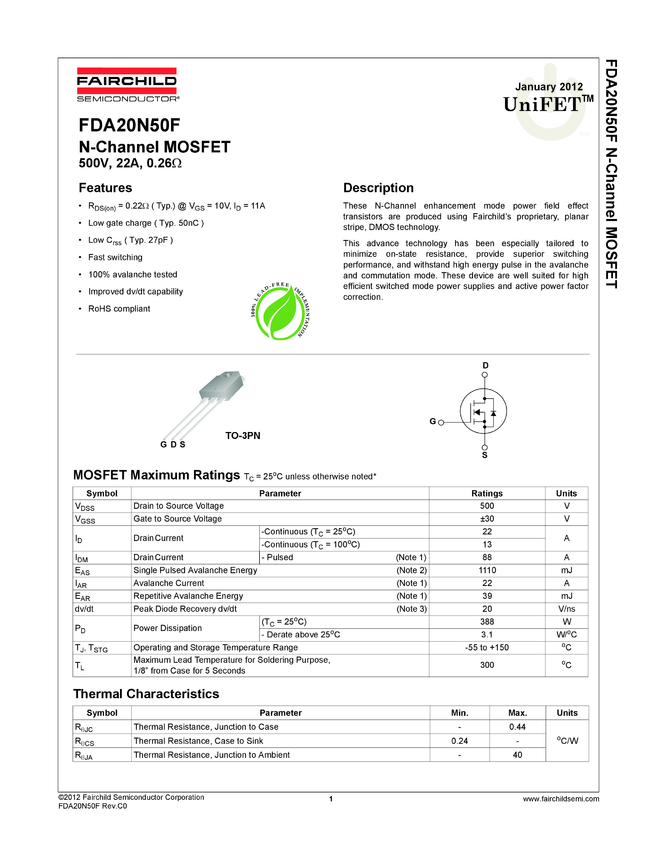 N-Channel UniFETTM FRFET® MOSFET 500V, 22A, 260mΩ