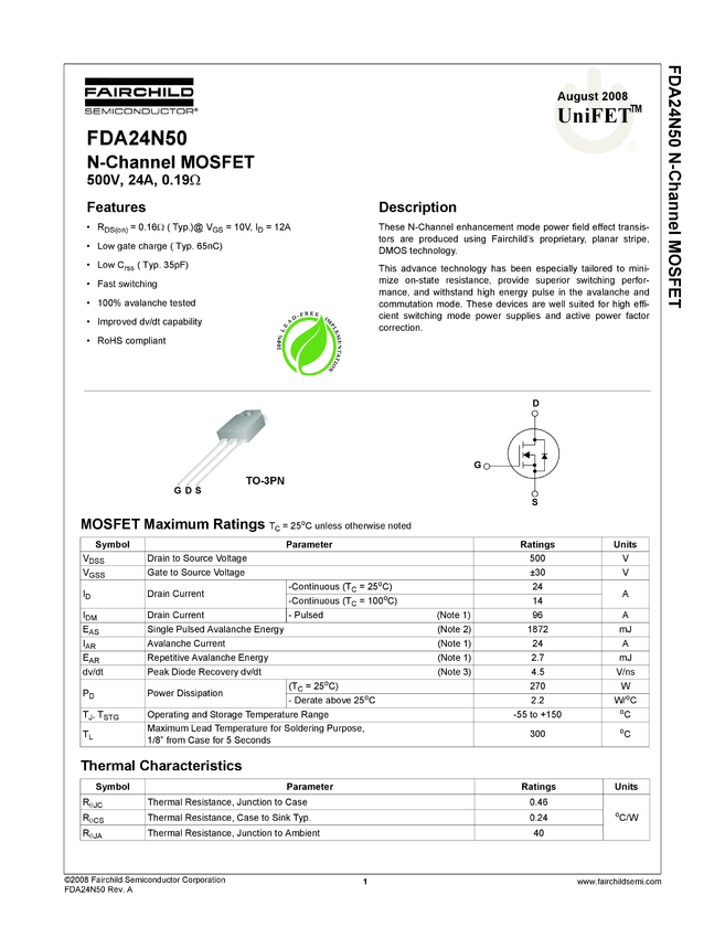 N-Channel UniFETTM MOSFET 500V, 24A, 190mΩ