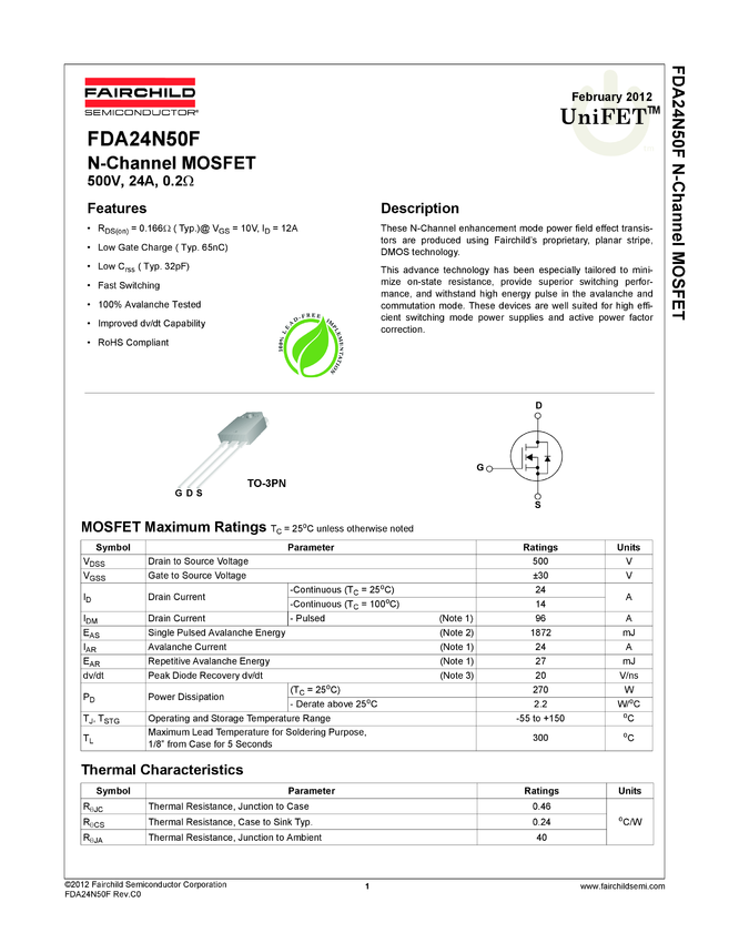 N-Channel UniFETTM FRFET® MOSFET 500V, 24A, 200mΩ