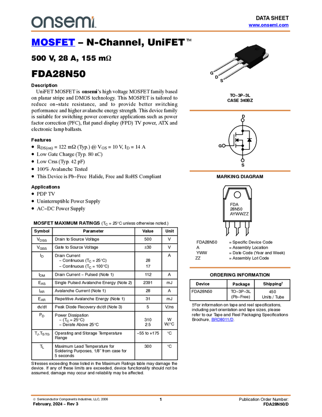 N-Channel UniFETTM MOSFET 500V, 28A, 155mΩ
