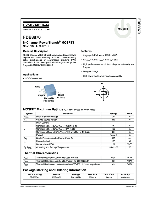 30V, 160A, 3.2mΩ, D2PAK N-Channel PowerTrench®