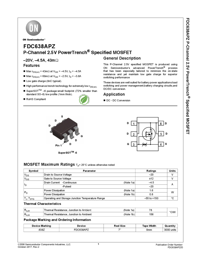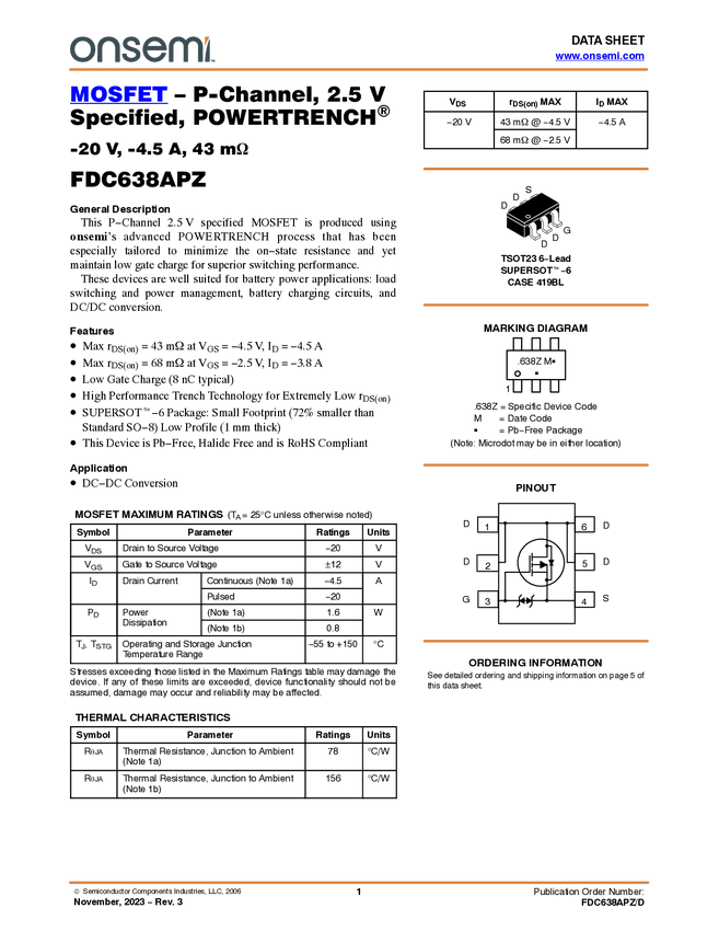 P-Channel PowerTrench<sup>® MOSFET, 2.5V specified, -20V, -4.5A, 43mΩ