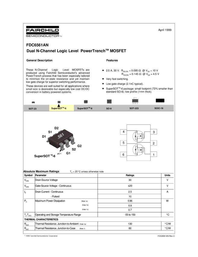 Dual N-Channel PowerTrench<sup>® MOSFET, Logic Level, 30V, 2.5A, 95mΩ