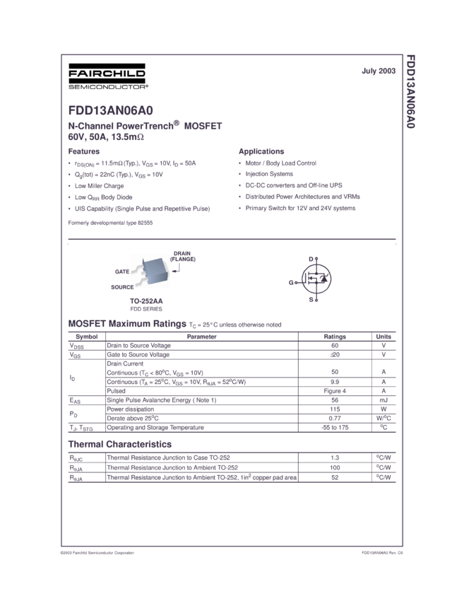 N-Channel PowerTrench® MOSFET 60V, 50A, 13.5mΩ