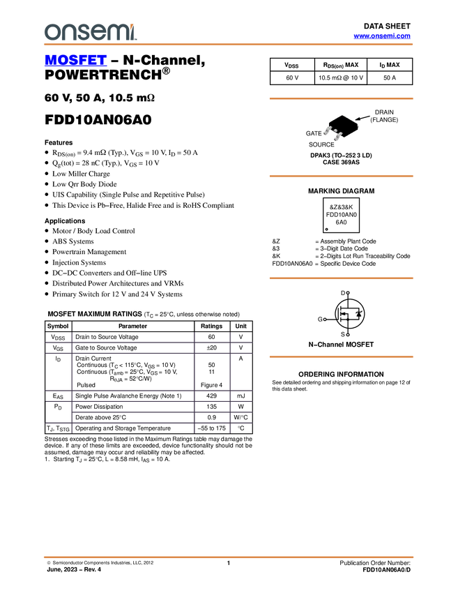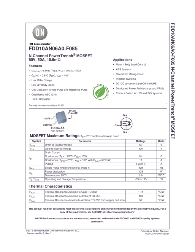 N-Channel PowerTrench® MOSFET 60V, 50A, 10.5mΩ