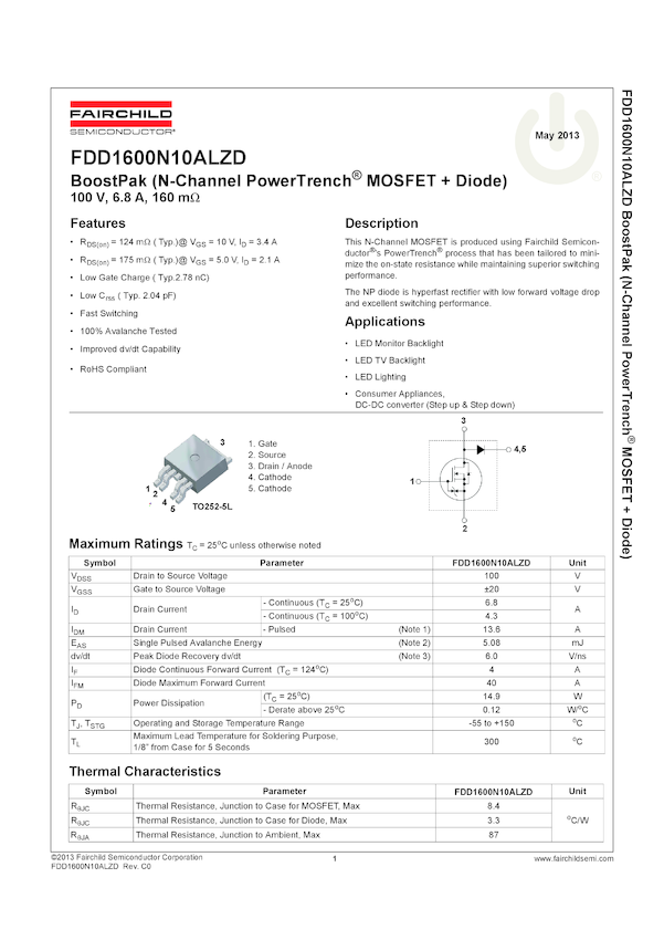 BoostPak (N-Channel PowerTrench® MOSFET + Diode) 100 V, 6.8 A, 160 mΩ