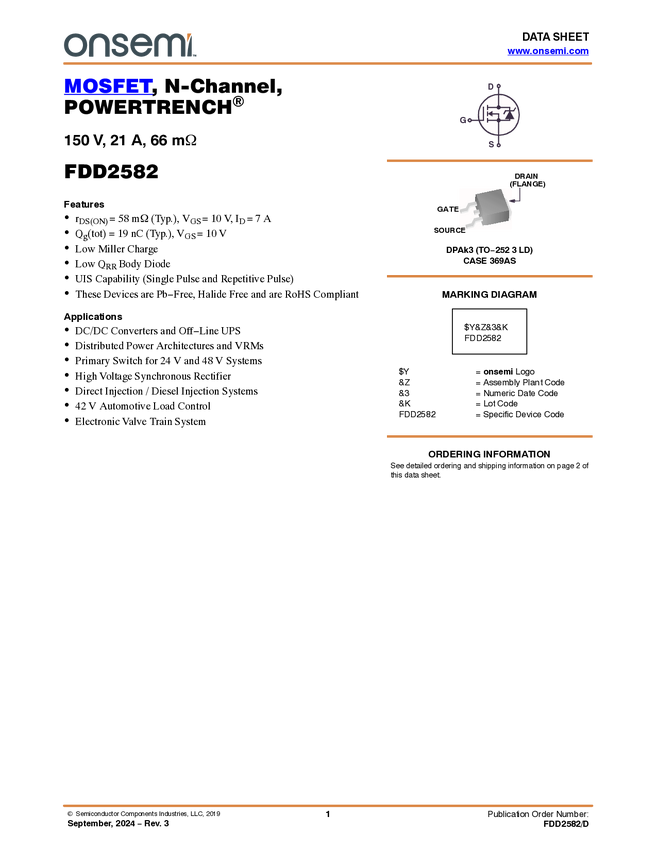 N-Channel PowerTrench<sup>® MOSFET 150V, 21A, 66mΩ