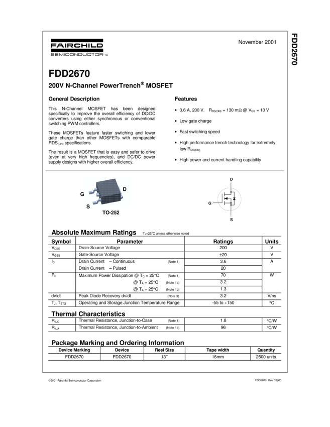 N-Channel PowerTrench<sup>® MOSFET 200V 3.6A, 130mΩ