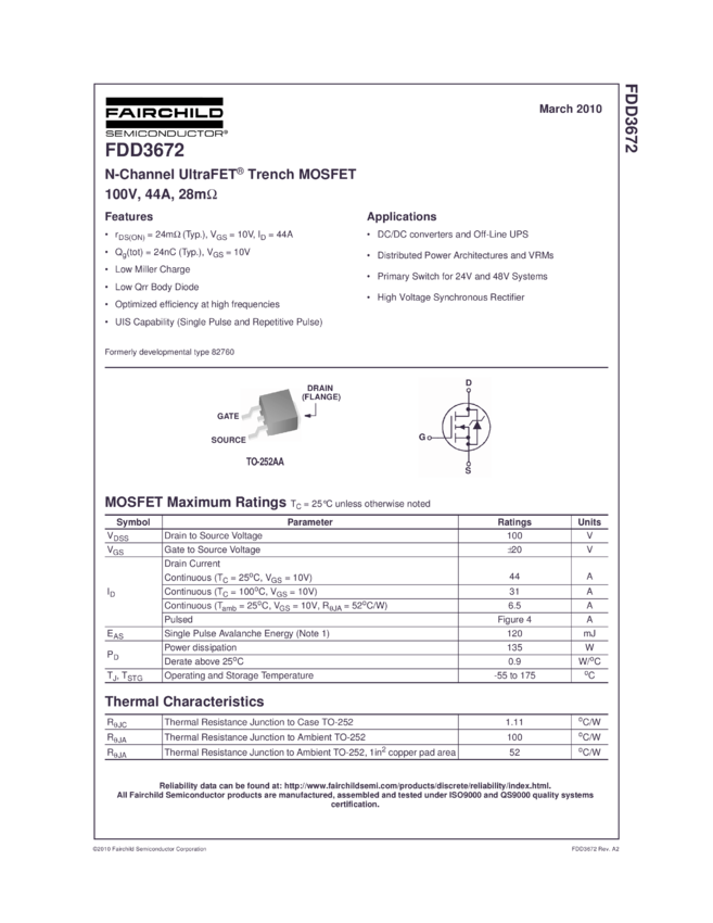 100V, 44A, 24mΩ, DPAKN-Channel UltraFET® Trench