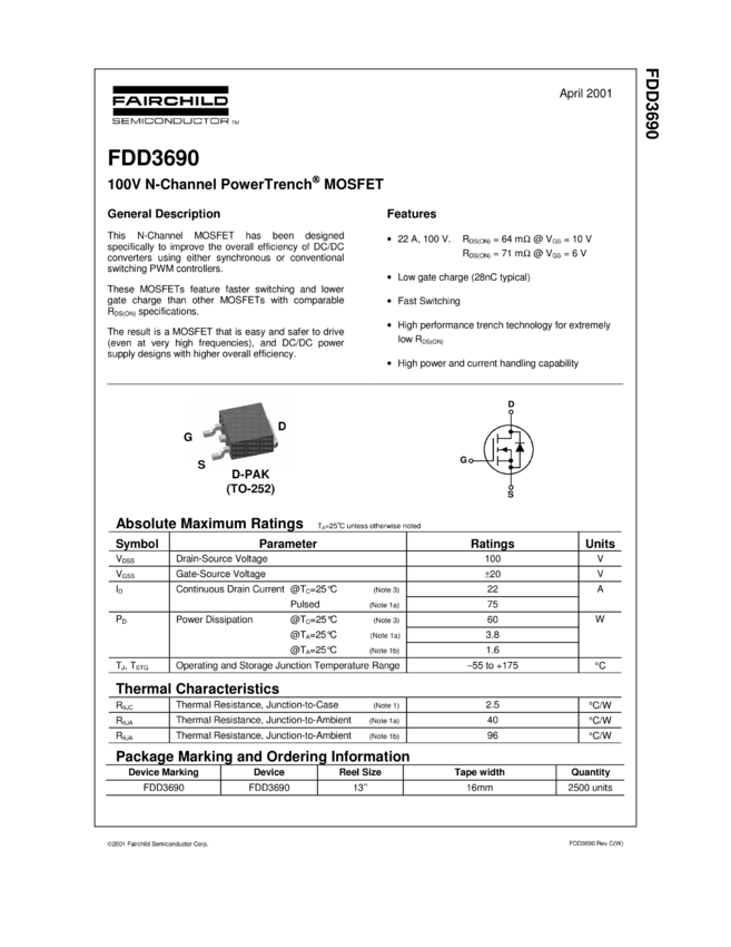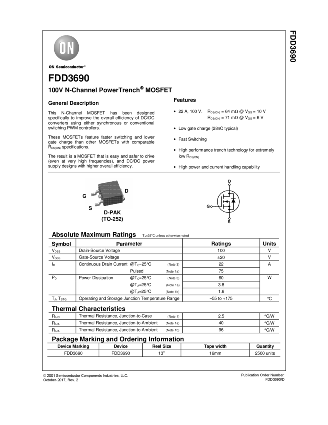 100V N-Channel PowerTrench<sup>® MOSFET 22A, 64mΩ