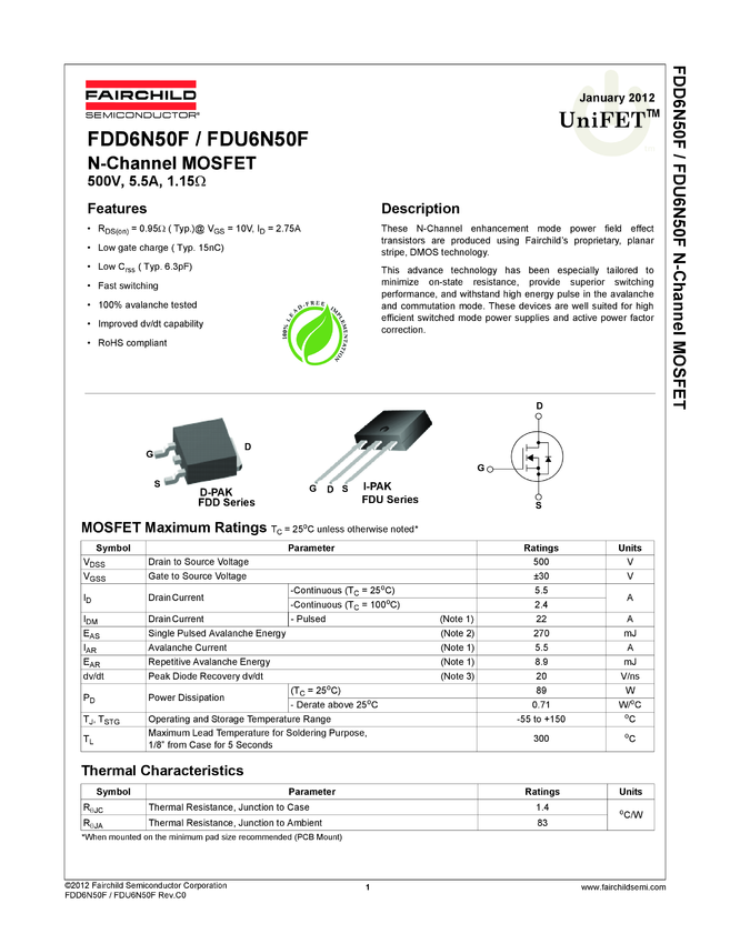 N-Channel UniFETTM FRFET® MOSFET 500V, 5.5A, 1.15Ω