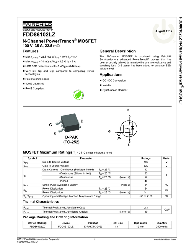 N-Channel Shielded Gate PowerTrench<sup>® MOSFET 100 V, 35 A, 22.5 mΩ