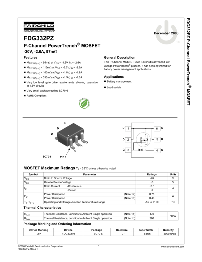 P-Channel PowerTrench<sup>® MOSFET -20V, -2.6A, 97mΩ