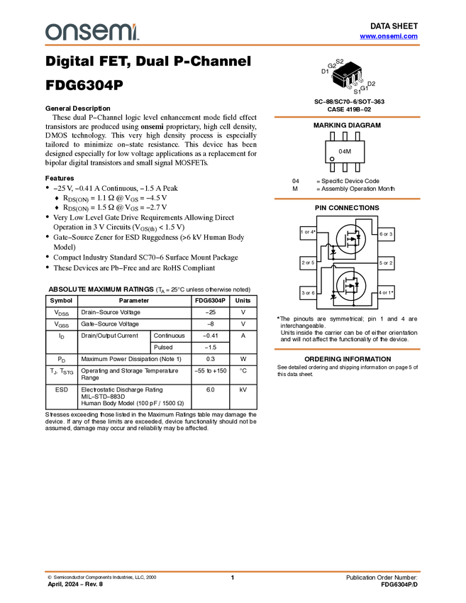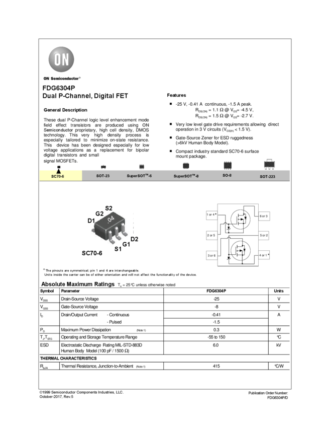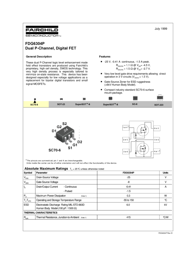 Dual P-Channel Digital FET -25V, 0.41A, 1.1Ω