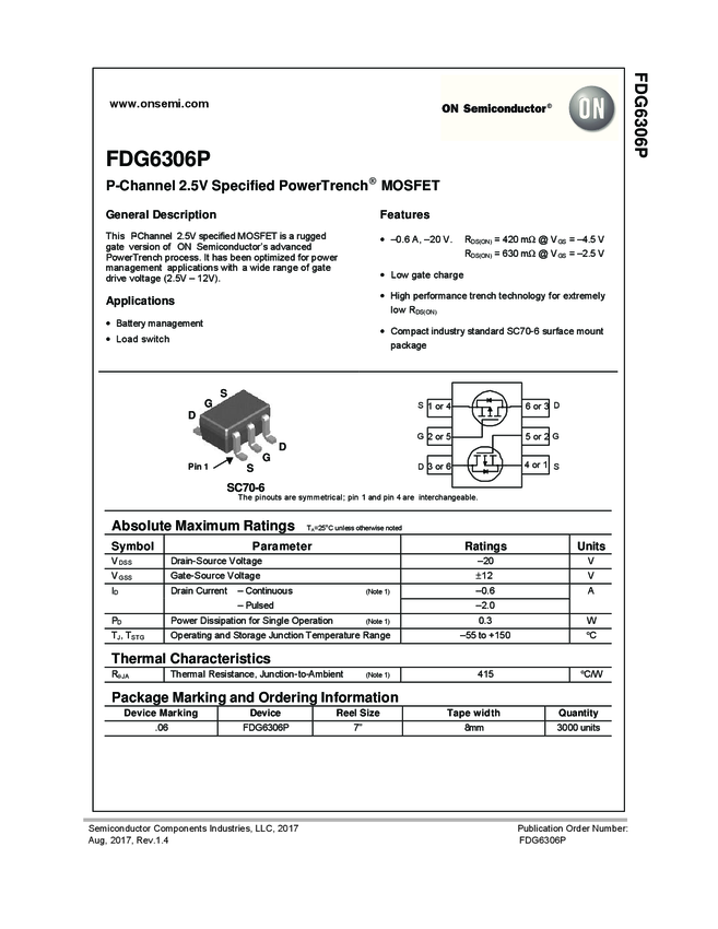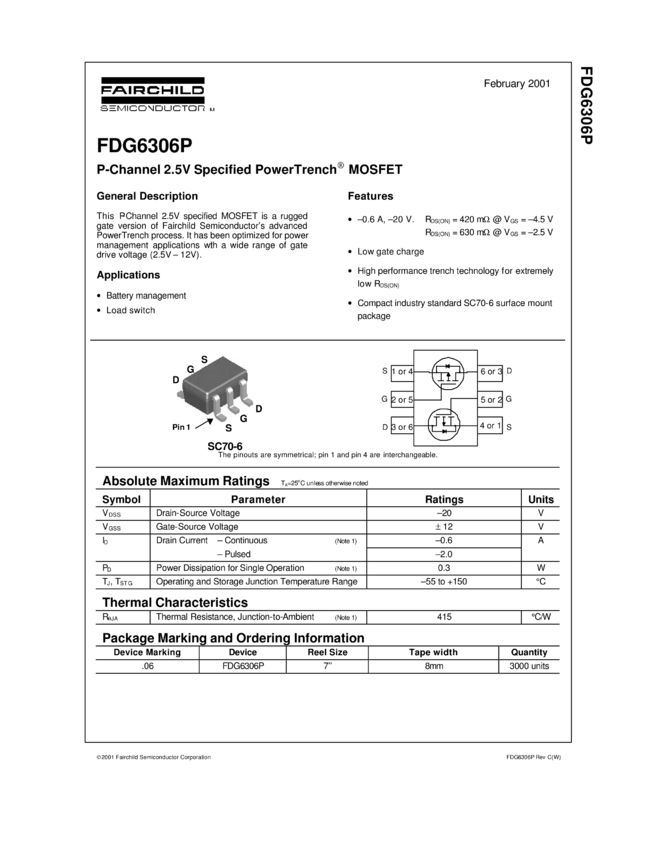 P-Channel 2.5V Specified PowerTrench<sup>® MOSFET -20 V, -0.6 A, 420 mΩ