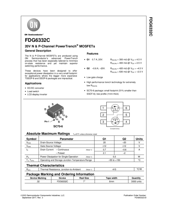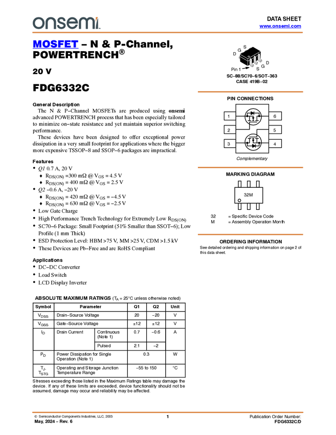 20V/-20V, 0.7/-0.6A, 300/420mΩ, SC-70-6N & P Channel PowerTrench®