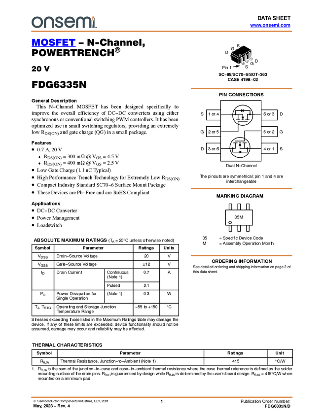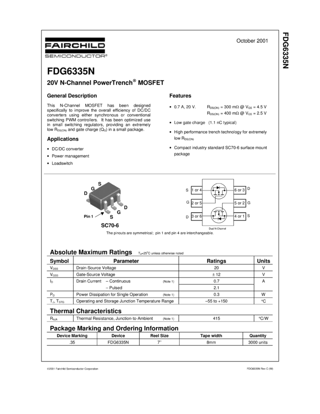 N-Channel PowerTrench<sup>® MOSFET, 20V, 0.7A, 300mΩ