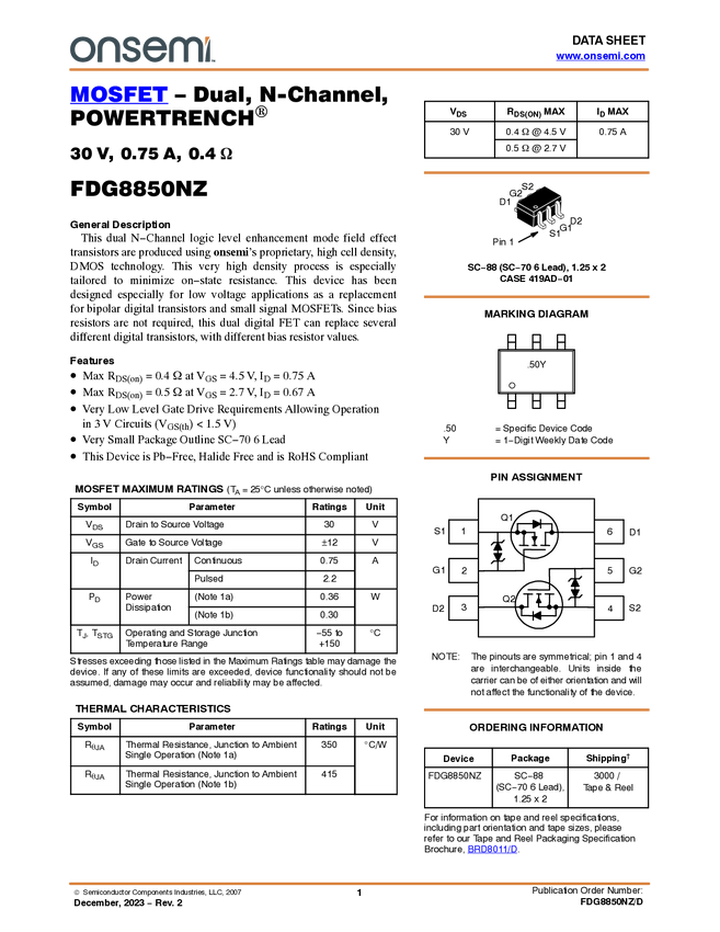 Dual N-Channel PowerTrench<sup>® MOSFET 30V, 0.75A, 0.4Ω