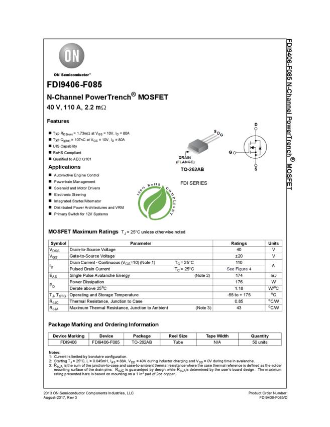 40V, 110A, 1.7mΩ, TO-262 N-Channel PowerTrench®