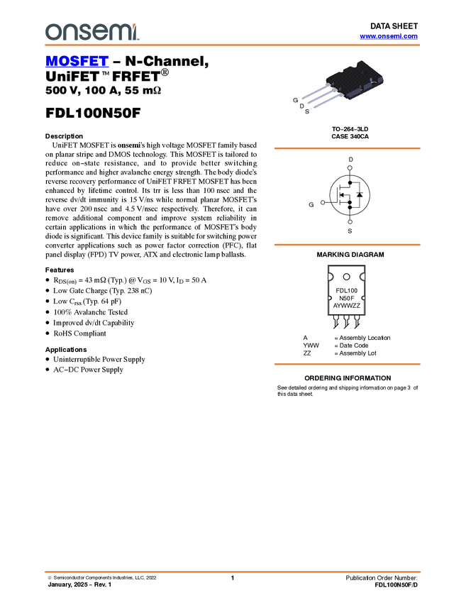 N-Channel UniFETTM FRFET® MOSFET 500V, 100A, 55mΩ